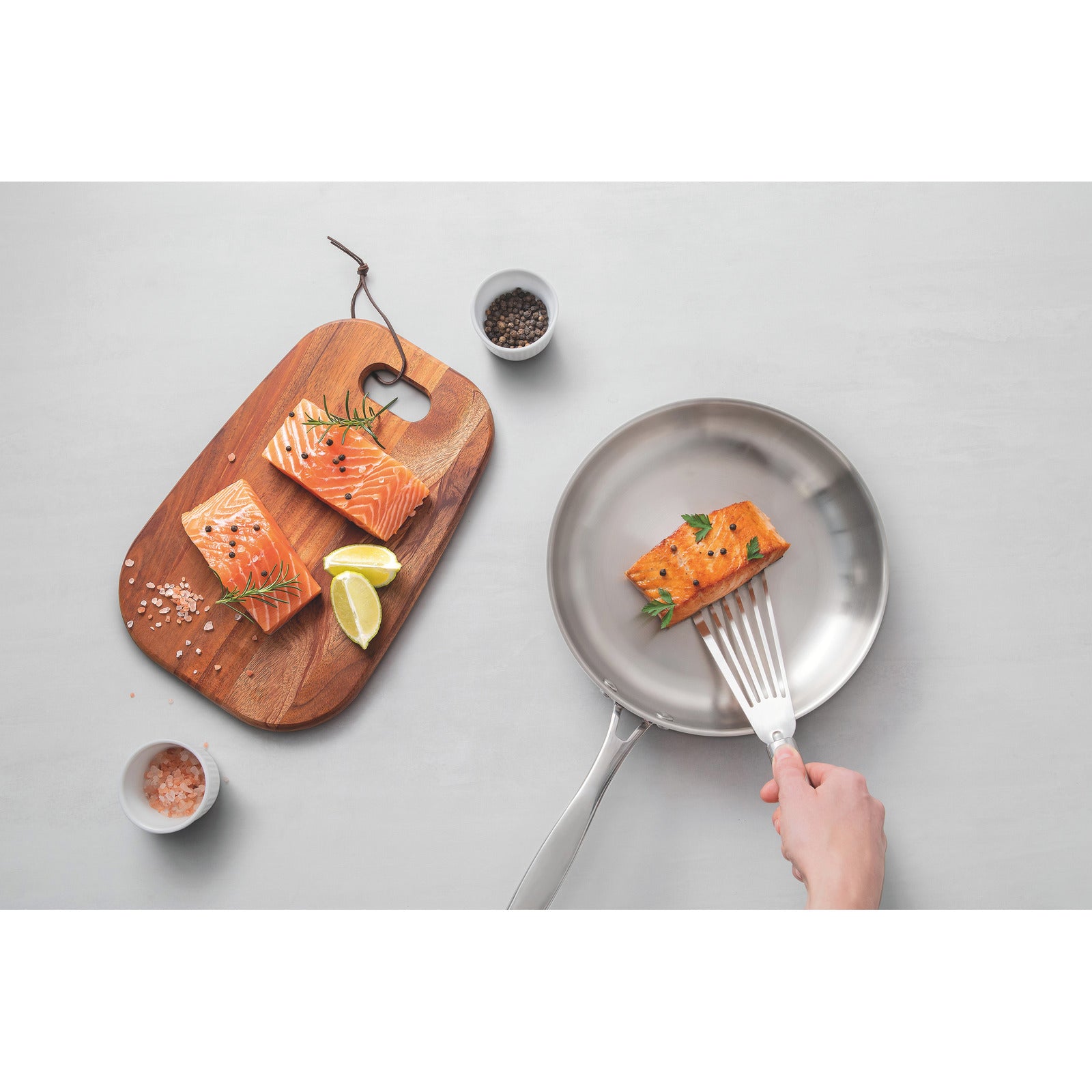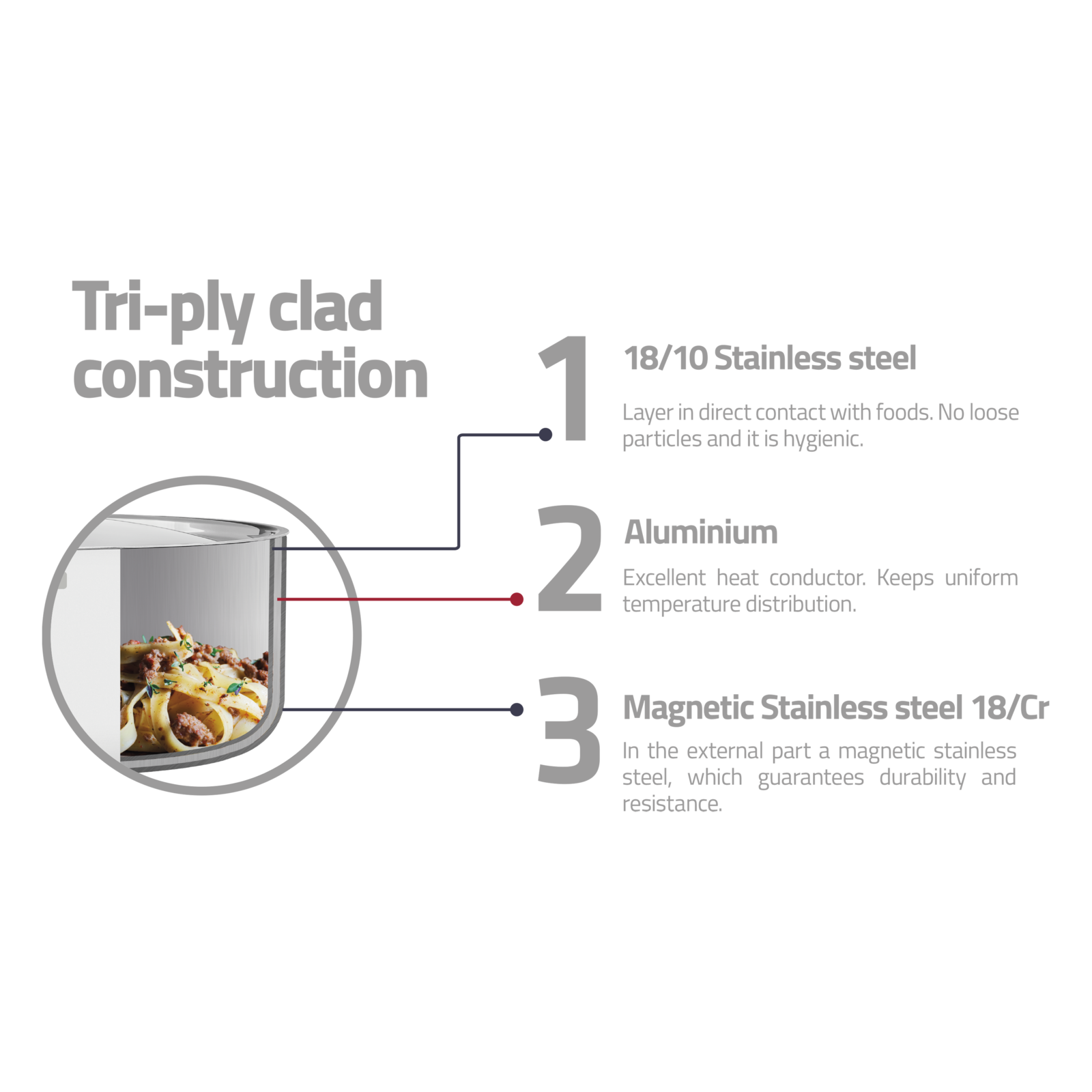 The tri-ply body is a hallmark of high-end cookware, prized by professional chefs and cooking enthusiasts alike. The stainless steel exterior provides durability, resistance to corrosion, and a sleek, polished look, while the aluminum core offers superior heat conductivity, allowing the pan to heat quickly and maintain a consistent temperature across its entire surface. This combination makes the Grano frying pan not only highly functional but also a premium-quality product built to last.